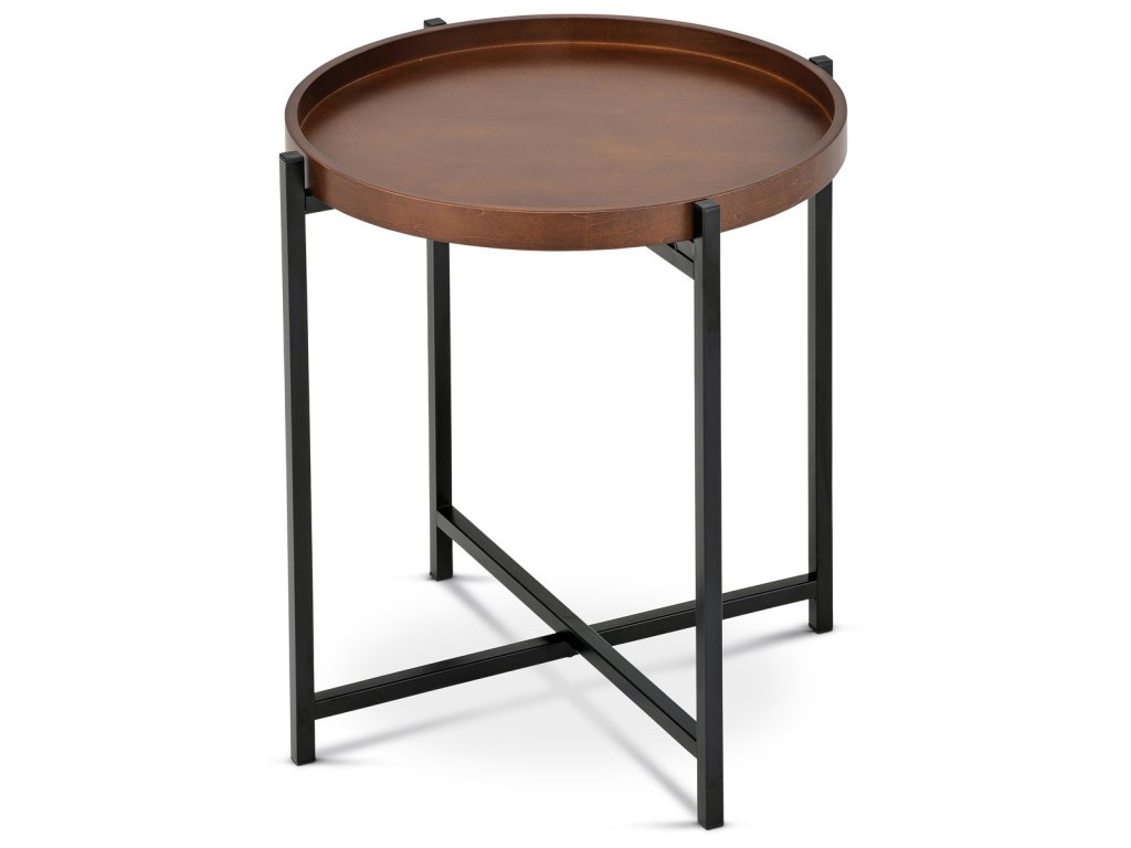 Popis: Odkládací stolek v industriálním stylu v lehkém nádechu orientu a kulatého tvaru. Konstrukce v sobě spojuje vyjímatelný dřevěný tác z bukové překližky, mořené do odstínu ořech a subtilní podnoží zhotovené z kovových profilů čtvercového průřezu 1,6 x 1,6 cm v černé matné práškové barvě. Právě tato podnož zajišťuje vysokou a dokonalou stabilitu celého stolku i při úplném naplnění tácu, který disponuje velkým vnitřním průměrem 44 cm a hloubkou 2 cm. Vnější průměr je 46 cm a hloubka 3 cm. Přesto stolek působí velmi odlehčeně a subtilně.